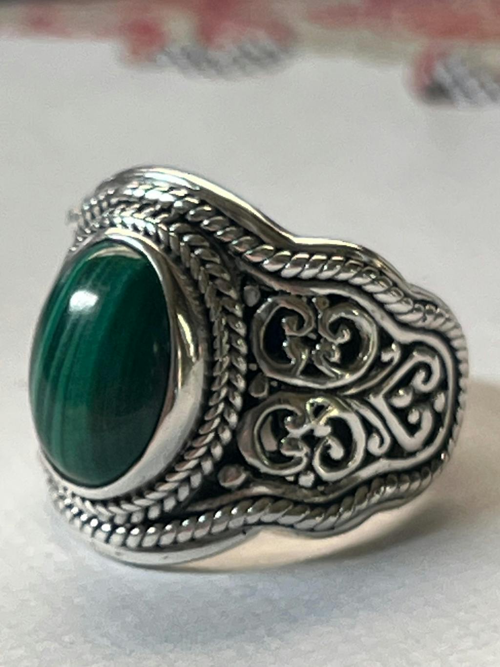 A beautiful green malachite in my favorite tree of life design. The ring is beautifully designed and fits very comfortably on my finger. I’ve received many compliments on it. Thank you for another beautiful piece to add to my collection!