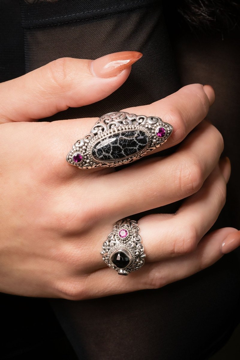 Sterling Silver Tree Of Life Black Indonesian Coral & Rhodolite Garnet Dinner Ring™