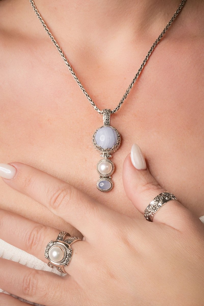 Praise & Hallelujah Thru It Pendant™ in Blue Lace Agate, Freshwater Pearl & Chalcedony