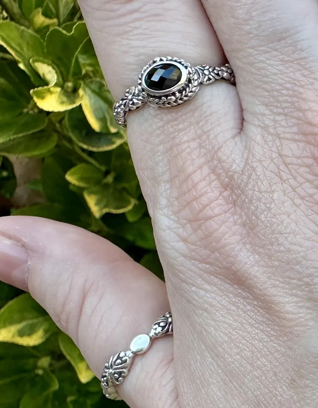 This ring set is absolutely beautiful! The black stone shimmers in the light and the setting is so vintage looking! The stacking ring is so cute, as well! I am wearing it as a thumb ring. Love both rings!