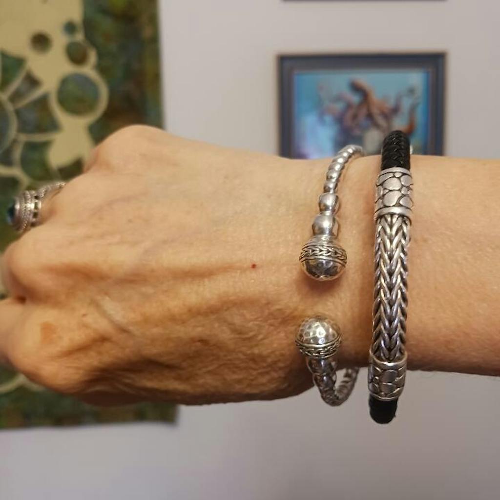 I love this bracelet. It goes with all my other Sarda bracelets especially my twisted oval bangle. I wear it all the time. It is super easy to put on and since it is oval it doesn't spin. Fun design and the tiny chainlink on the 2 hammered main balls match some of my rings. Thanks Janyl for another winner!