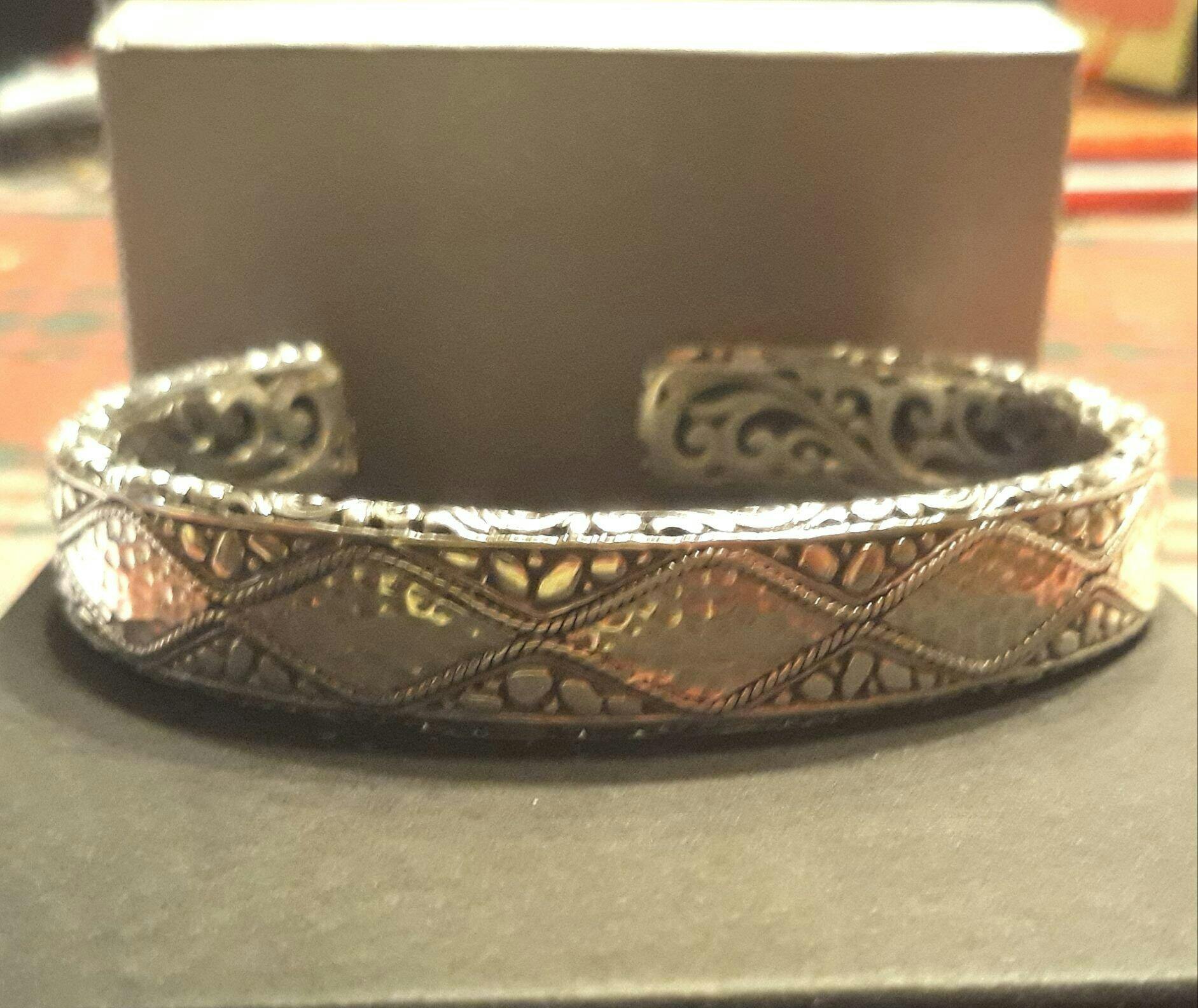 - This sterling silver watermark & hammered oval cuff bracelet combines intricate watermark and hammered motifs, creating a stunning design that catches the light and adds a distinctive, handcrafted touch. The oval shape provides a comfortable fit on the wrist, while the single retention kickback ensures this bracelet is easy to put on and remove while staying securely in place throughout the day. Crafted from high-quality sterling silver, the bracelet is both durable and timeless, designed to withstand everyday wear.