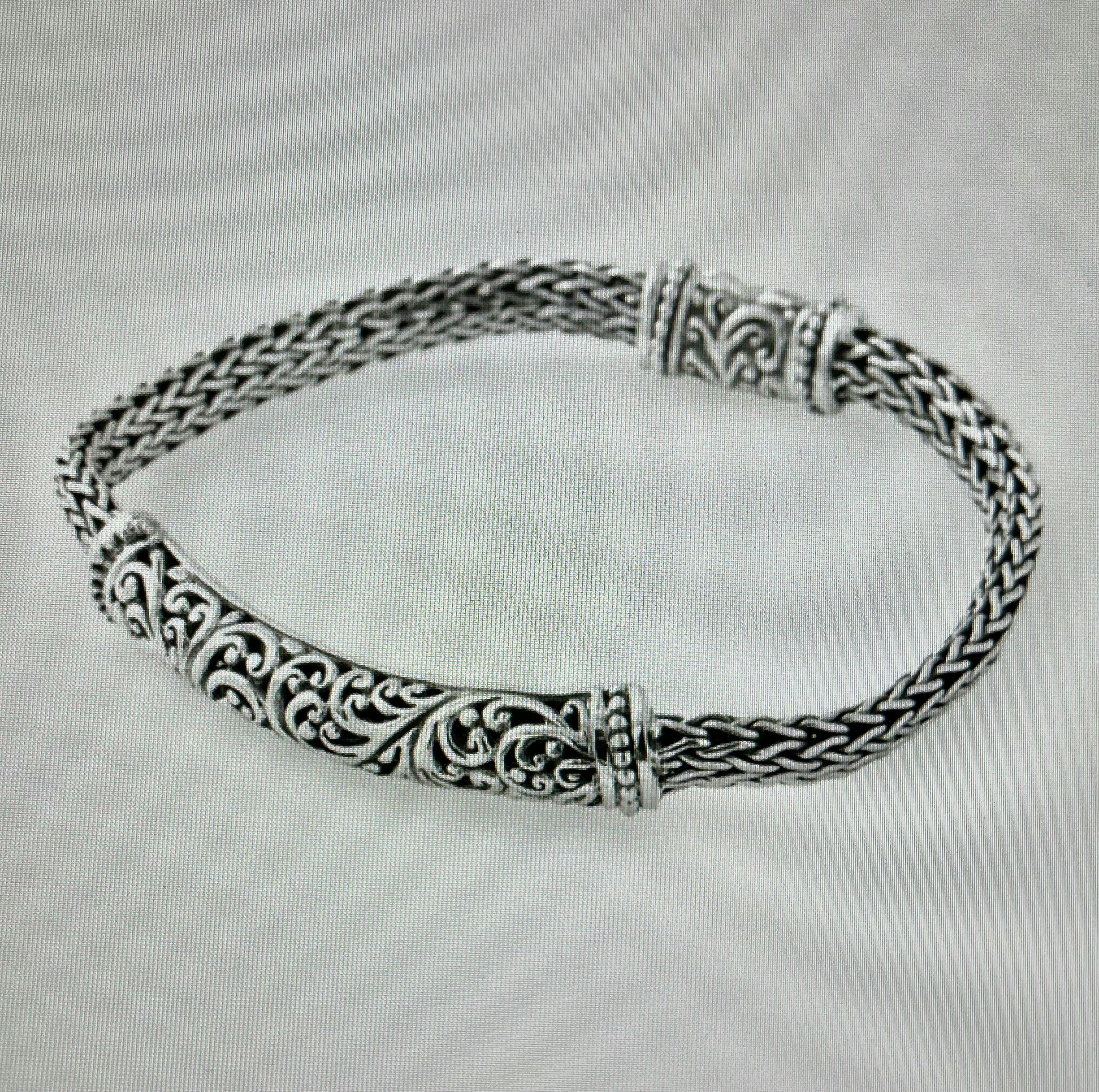 A really pretty bracelet, perhaps for everyday wear, combining the delicate and impressive 'Tree of Life' filigree-work with the traditional and substantial tulang naga chain. A fine example of extraordinary Balinese artistry and craftsmanship.