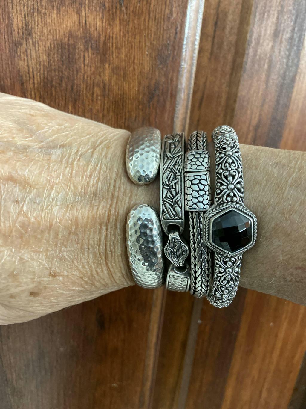 This is a hurry grab and go bracelet. So easy to put on. It's so stylish with the tip tip style and the hammered motif.