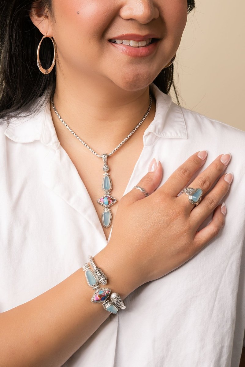 Sterling Silver Tree Of Life & Hammered Sweetart Kingman Turquoise & Paraiba Chalcedony Adjustable Multi Stone Chain Toggle Bracelet™