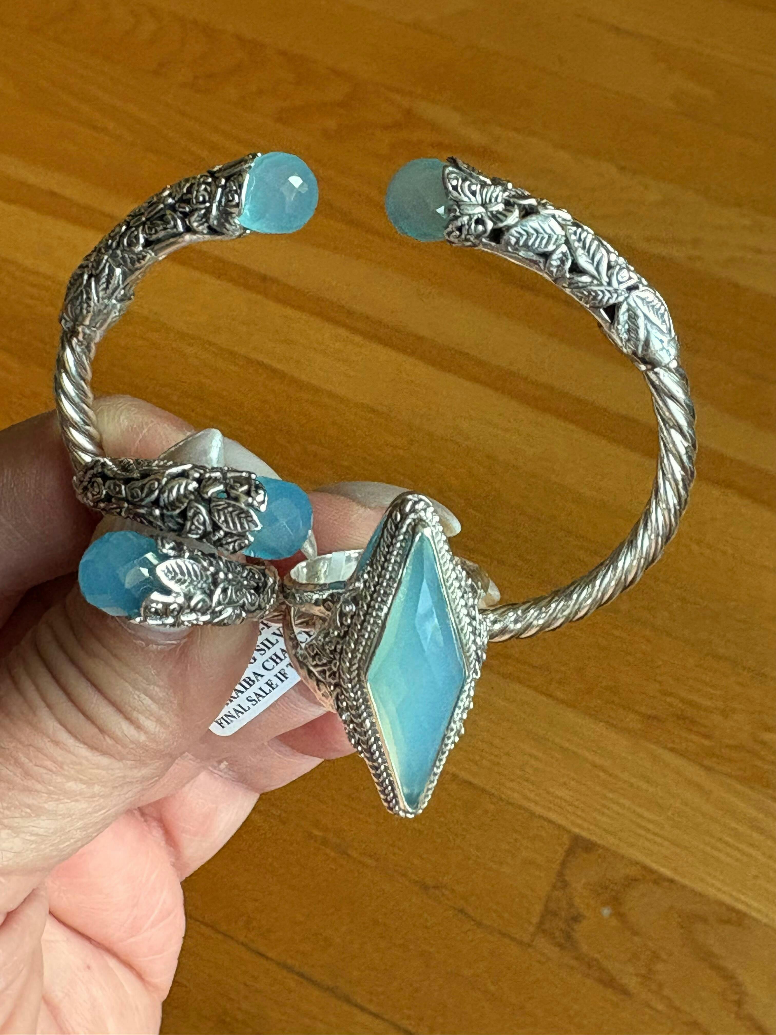 Love this bracelet!! So comfortable to wear!! Can be stacked with other bracelets for a bigger spectacular look, (see below). The Paraiba stones in this bracelet are beautiful in color and the cut of the stones, stunning!!! Another masterpiece!!!