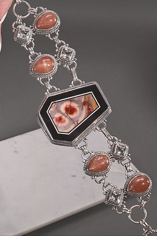 Sterling Silver Bird's Eye Rhyolite & Black Calcite, Peach Sunstone & White Topaz Adjustable Multi Stone Toggle Bracelet™