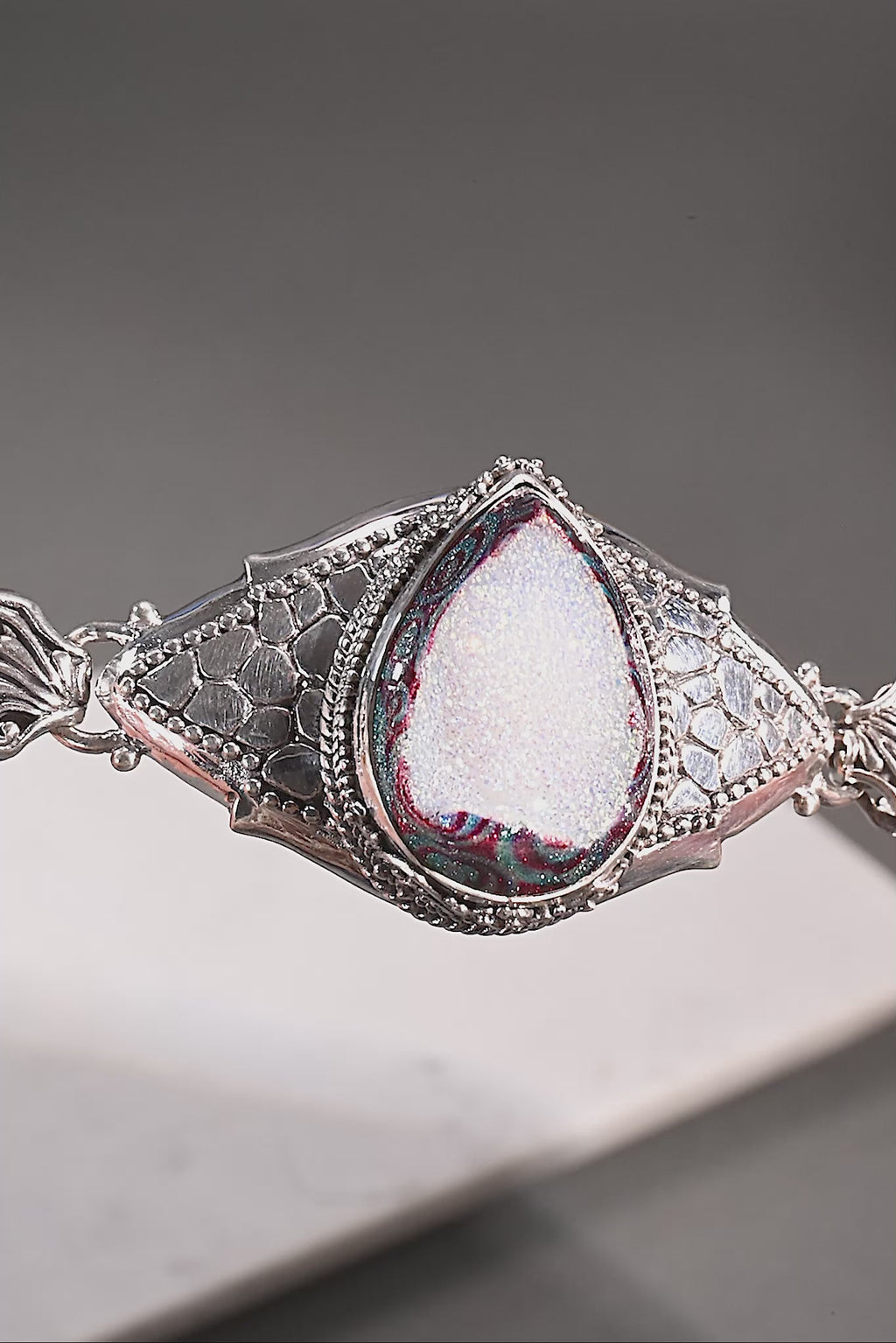 Sterling Silver Watermark & Hammered Painted Swirl Snow Window Drusy Adjustable Single Stone Multi Link Toggle Bracelet™