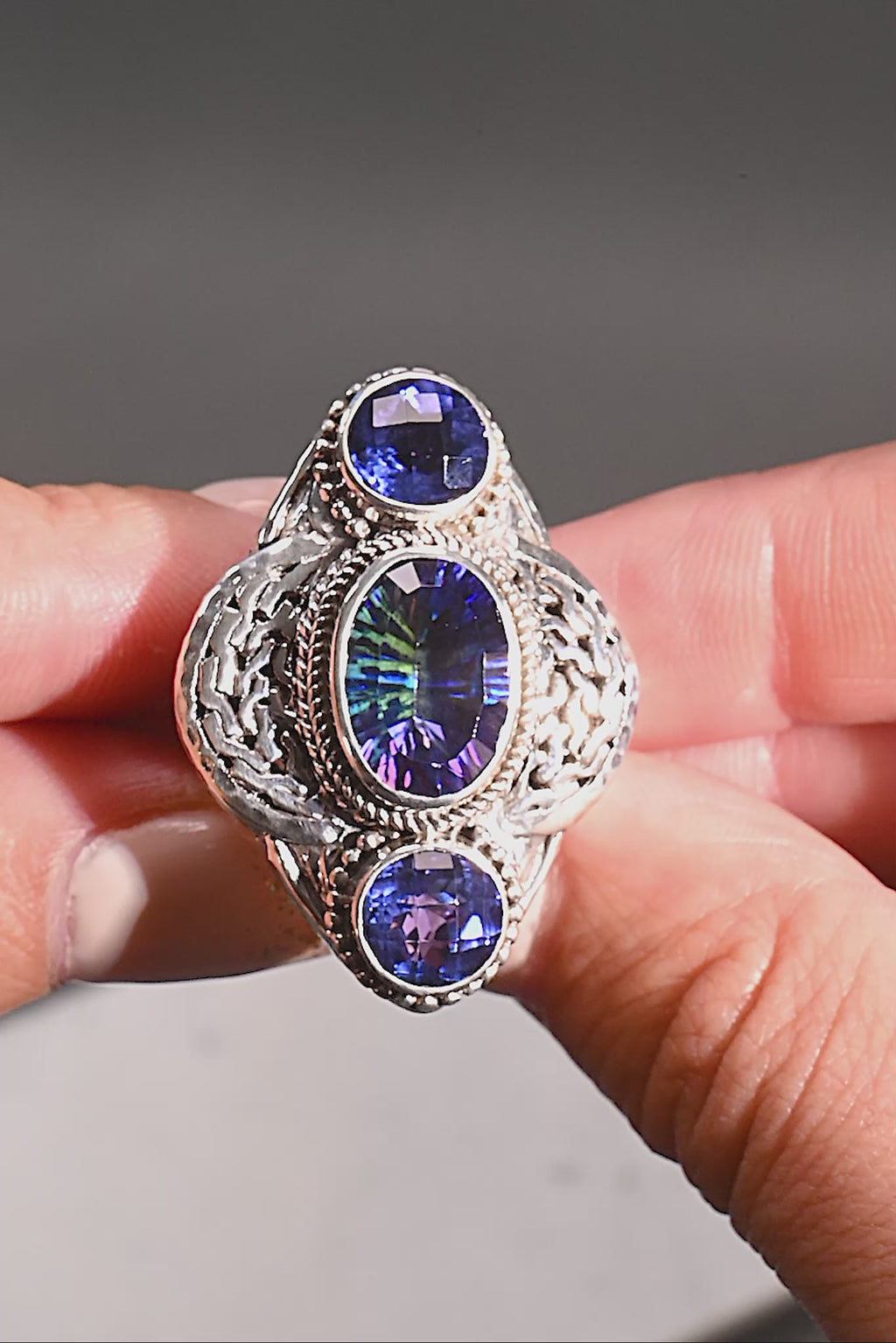 Sterling Silver Chainlink & Hammered Odyssey Universe™ Mystic Quartz & Blue Violet Fluorite Dinner Ring™