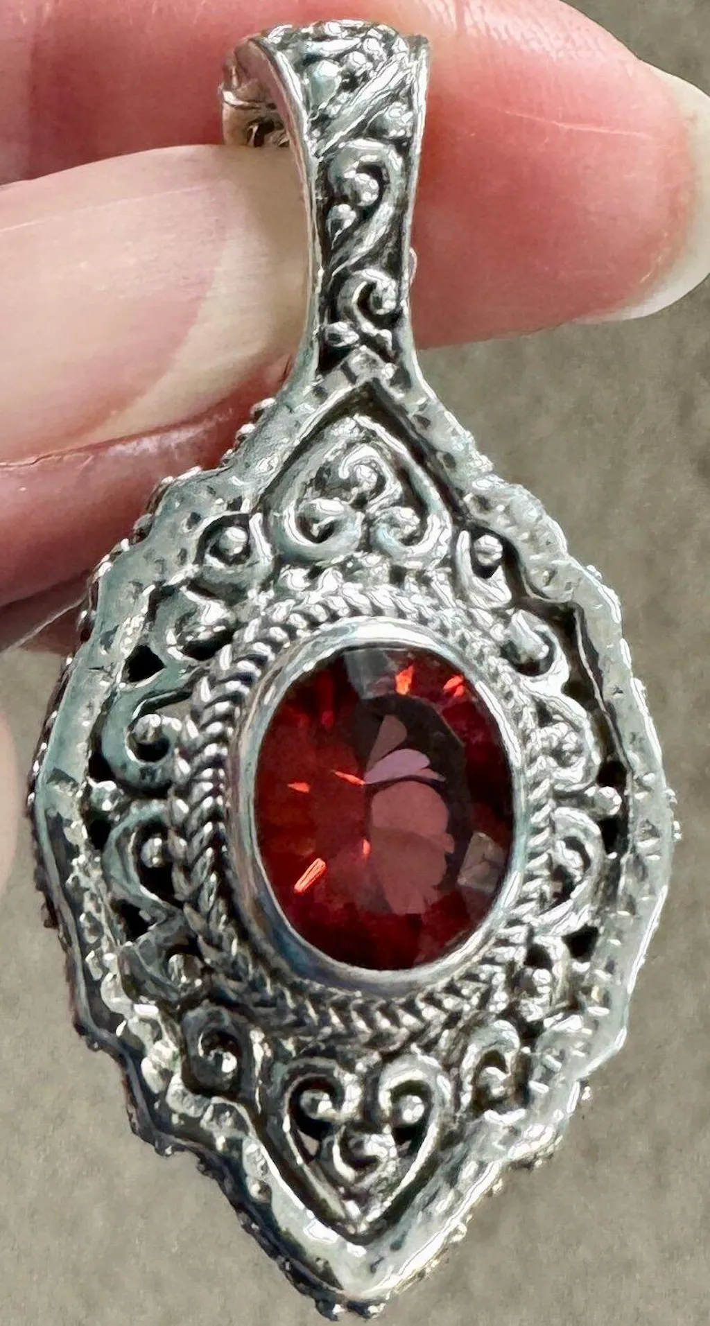 I have been watching the Red Pom Passion stone for awhile and decided to take advantage of this sale. It is a familiar design with hidden bail which makes a little more petite look. The stone is a good size and has a lovely sparkle in bright light. It will definitely pair with several other of Janyl's stones. Silver work with tree of life if amazing as usual. Very satisfied.