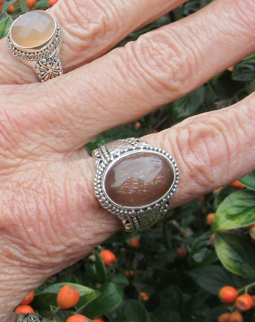 Love the cinnamon chocolate brown base with the glittery metallic gold and rainbow flashes. This stone is loaded with tiny inclusions creating a magical display of aventurescence. Love the ring design which focuses on the beauty of the Latte Sunstone. And not to forget the intricate under gallery with one of my favorite motifs - Tree of Life - with two sweet leaves incorporated in the design. The Latte Sunstone blends well with other earth tone colors. So happy to add this unique, gorgeous ring to my collection.