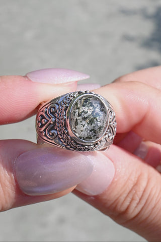 This is a great ring! I’ll be honest I’ve never been a fan of this style ring and have never bought it in any other stones, but I really wanted this stone so I went ahead and picked it up. I was very pleasantly surprised to find out that I love the ring design and style after all! It fits amazingly and I love how it showcases the stone so well. The Quartz Sagenitic is a very cool stone with lots going on inside of it. I find myself just sitting and staring at it and I love finding something new every time.