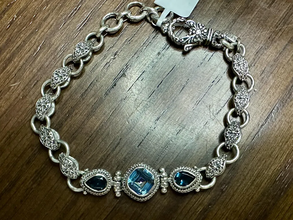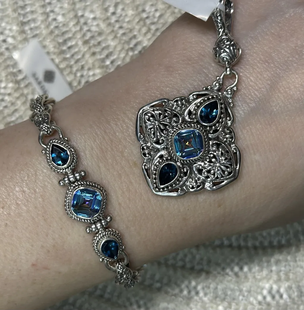 Winning color combo! The beautiful star faceted cushion cut true Picasso goes well with the deeply saturated London blue topaz. The links/connectors have the Adair motif on them and are so sweet. The bracelet is light as air even though it’s 21grams. Love these 3 stone bracelets- they are just the right size for me!! 💙💙💙