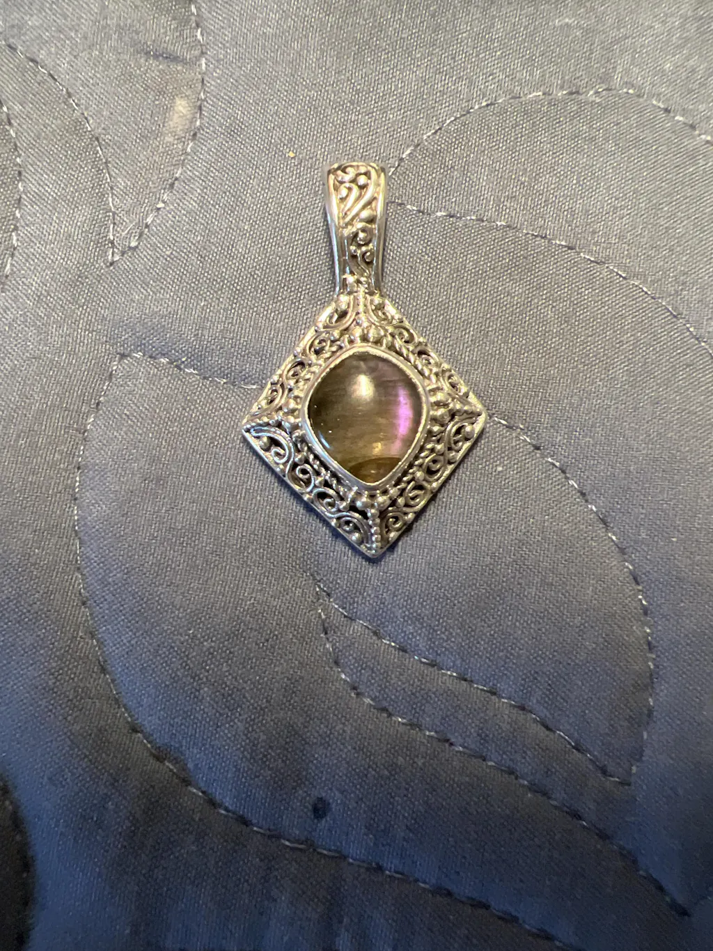 I love the diamond shape of this pendant. The silver work is unbelievably intricate! The color of the stone is mostly purple with hints of green, making it very unique. I like the size of the loop which will accommodate any size silver chain. I’m very pleased with this purchase.