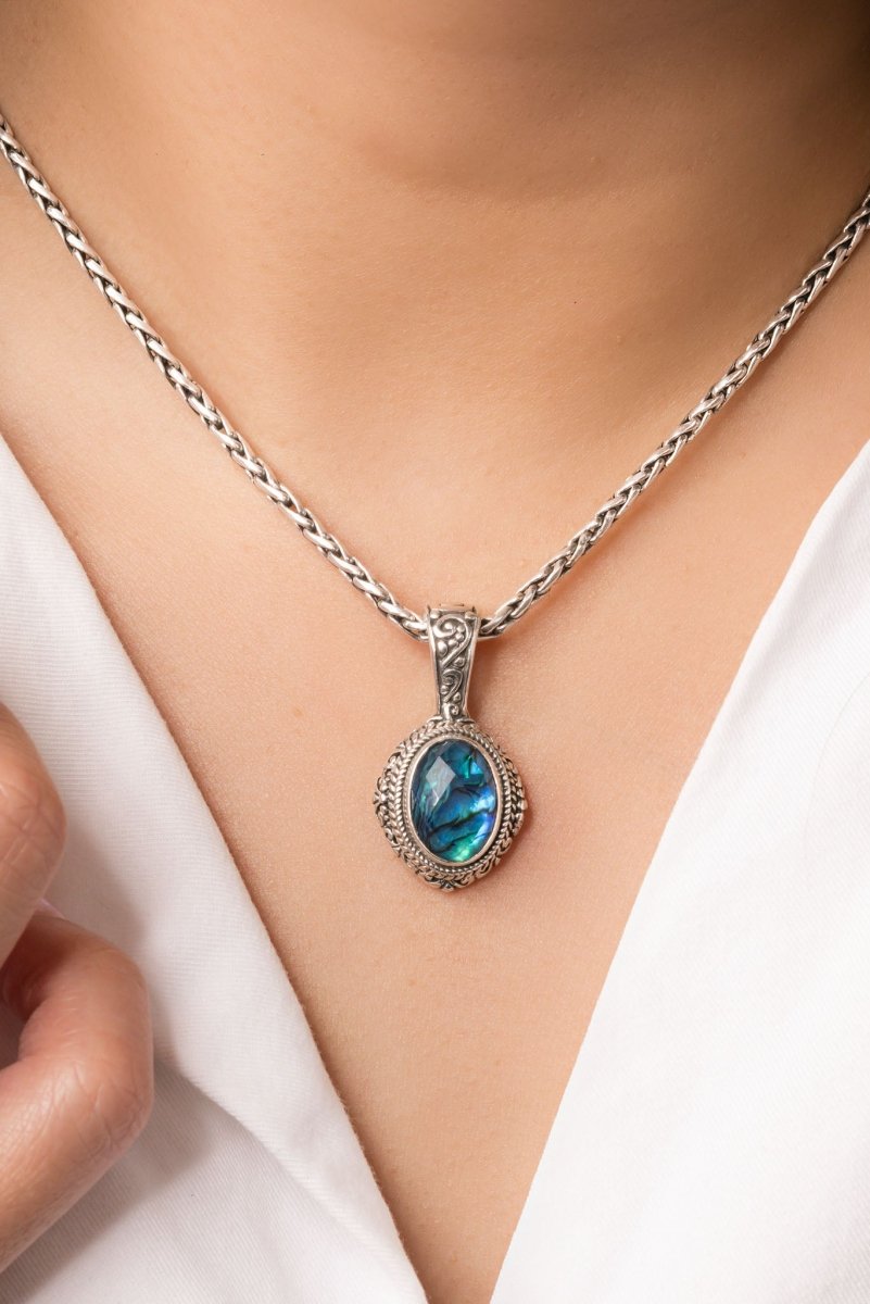 Sterling Silver Tree Of Life Bali Waters Abalone & Quartz Triplet Single Stone Pendant With Incorporated Magnetic Enhancer Bail™