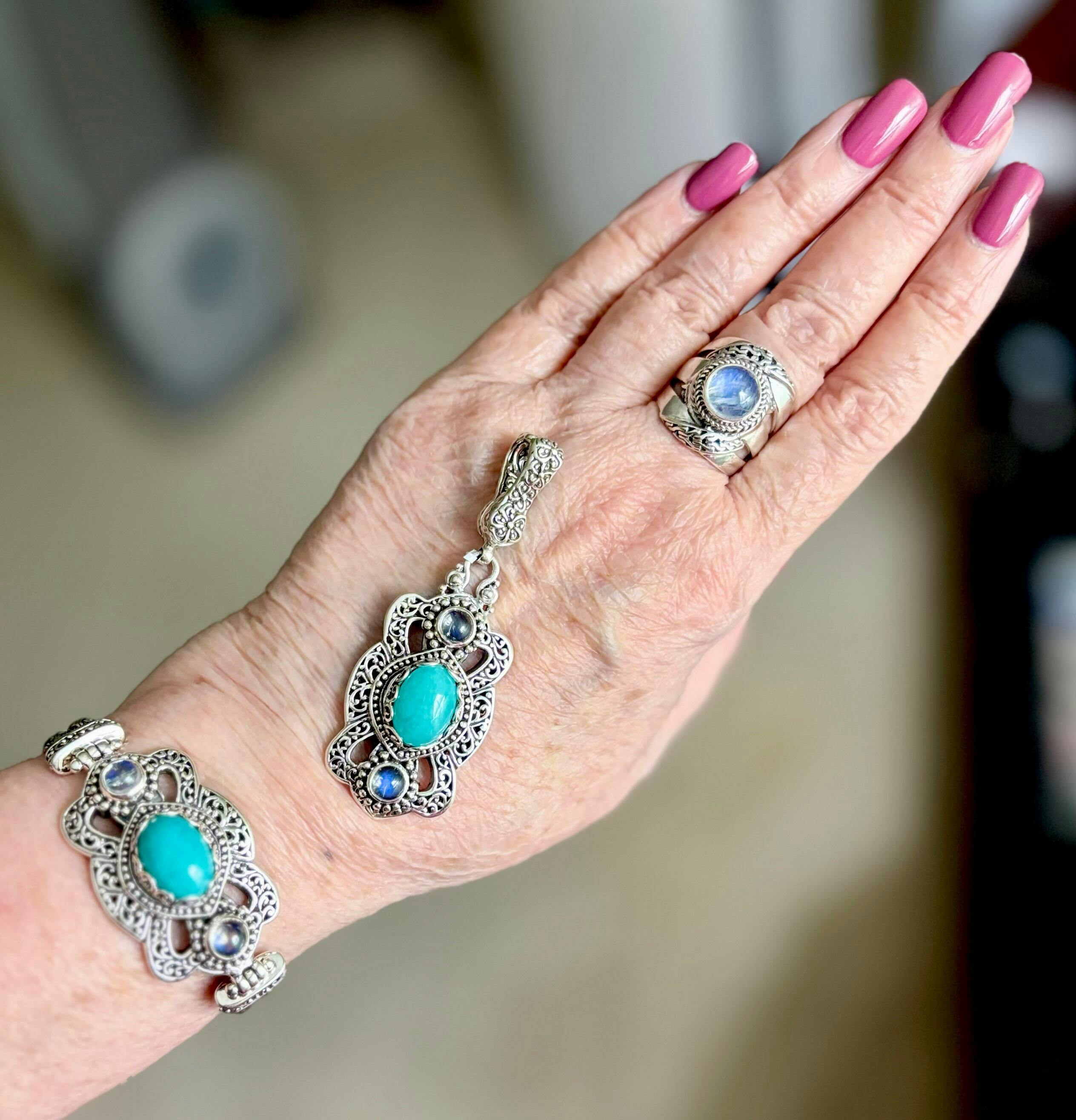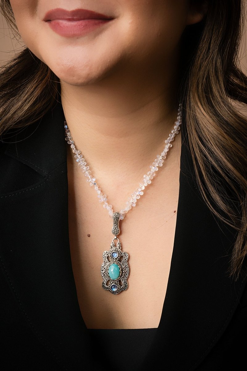 The stones themselves are gorgeous. The Amazonite has a serene, calming color, and the Rainbow Moonstone catches the light beautifully, adding a soft, magical glow. Together, they create a pendant that feels both elegant and meaningful.