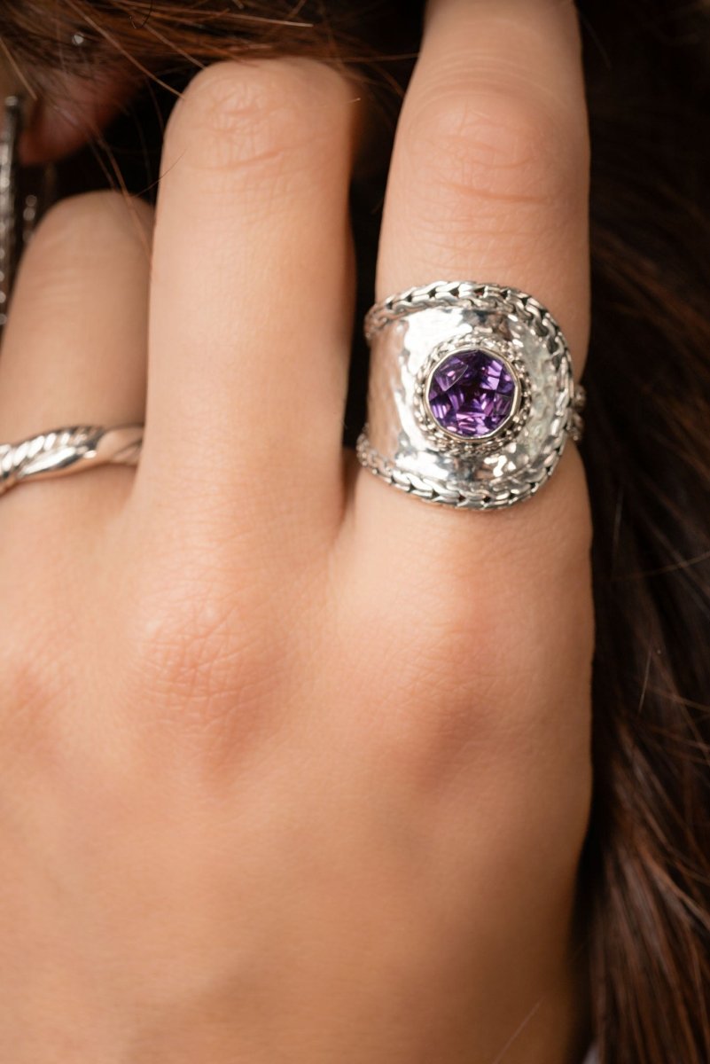 Sterling Silver Chainlink & Hammered Amethyst Ring™