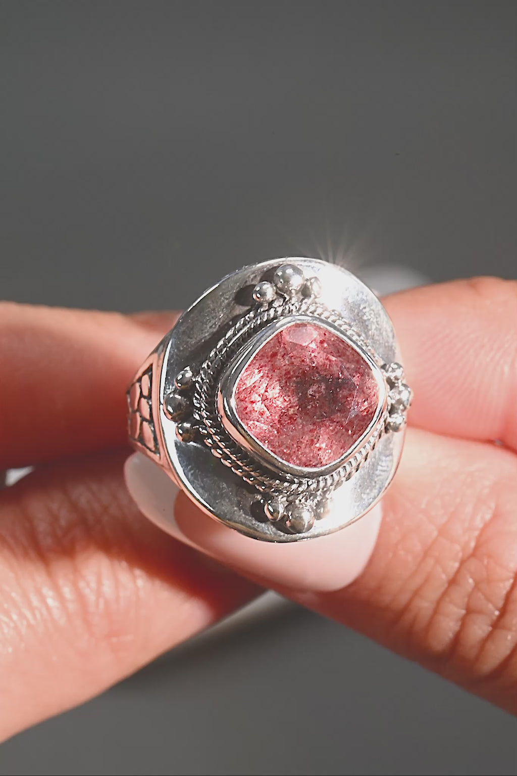 I just love strawberry quartz and this stone an exceptional one. The stone is bright and sparkling, with the little flecks of strawberry color it is magical. I love the ring setting as well, it's one of my favorites. Very low profile and it's sleek and sophisticated, the fit is perfect so that the ring does not roll around on the finger.