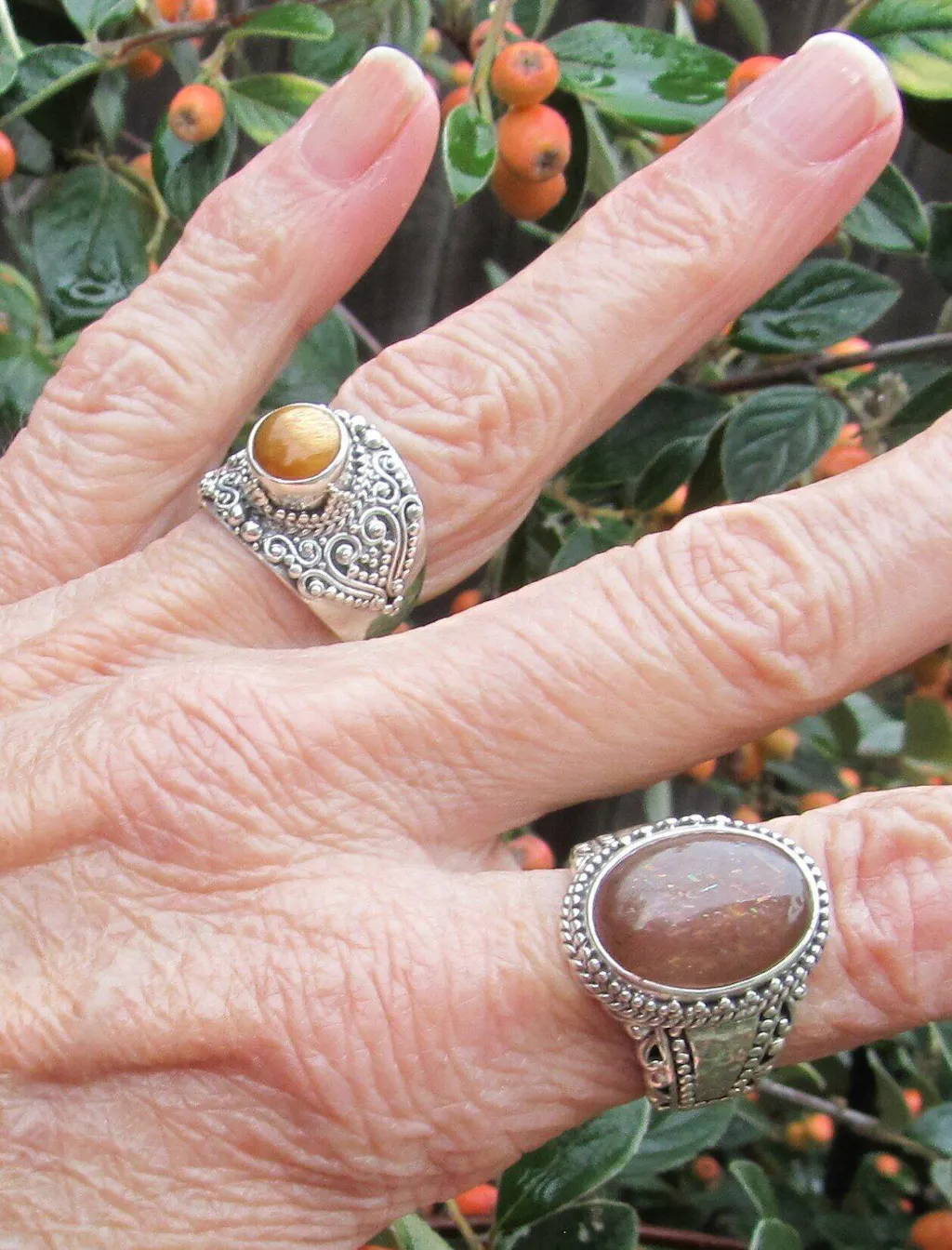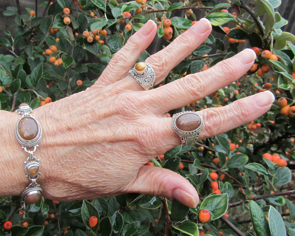 The golden sunstone is one of the prettiest stones I’ve seen, especially in the sunlight or direct light. Love the intricate silver work.