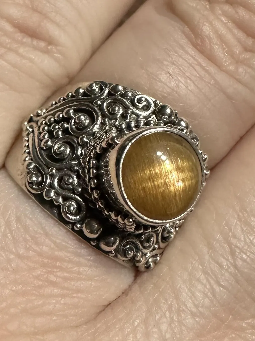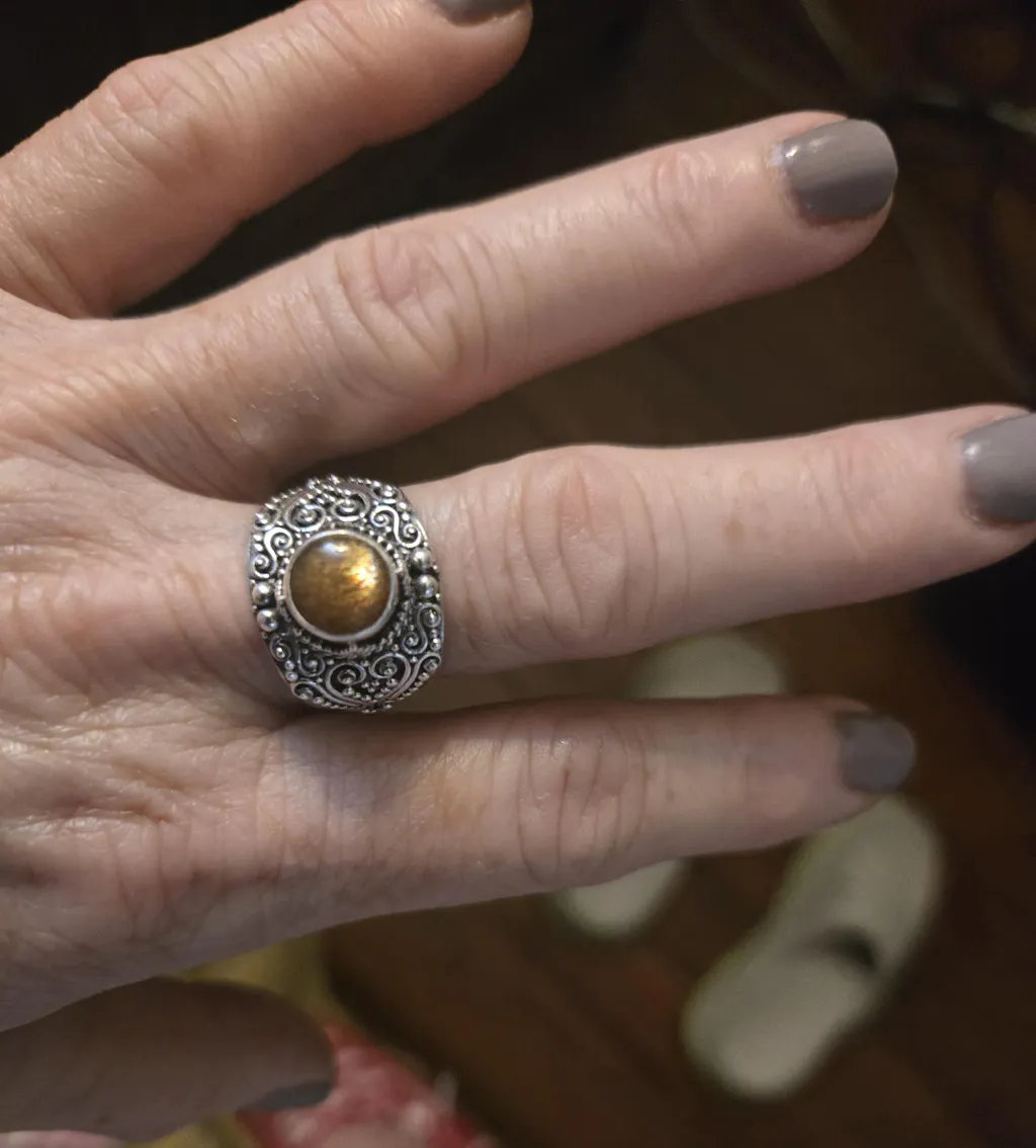 I am so in love with gold sunstone, I had to come back for a ring. I purchased the multi stone bracelet that has the gold sunstone in it and it was love at first site. The contrast of the warm gold against the gorgeous silver work is stunning. Comfortable ring with detailed granulation work that’s the icing on the cake.