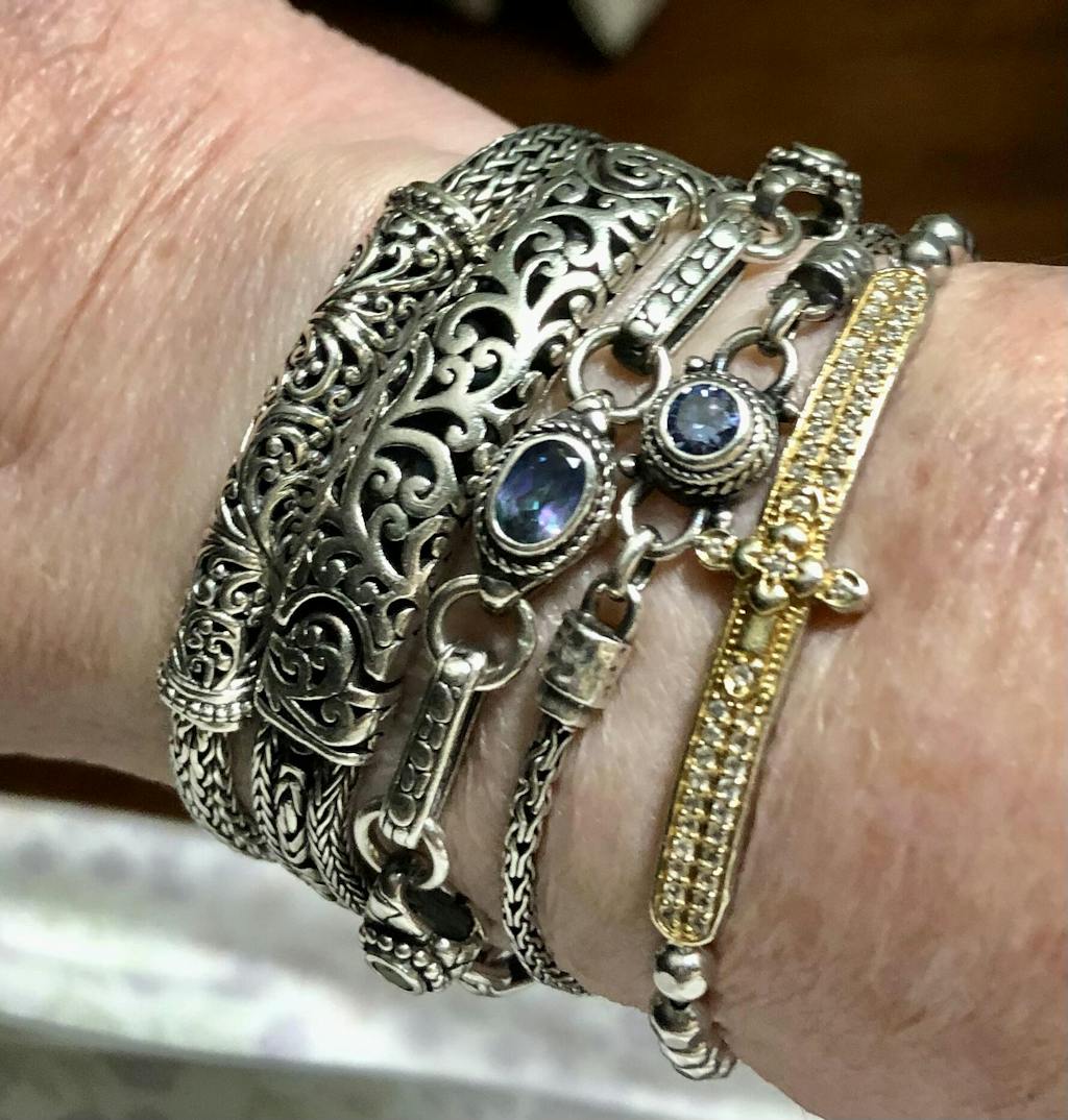 This is simply a beautiful bracelet. I have literally dedicated my right arm to silver chain type bracelets for over 35 years. The last 5 dedicated to only Sarda bracelets. At first I only wore all silver bracelets like this one. As you can see in the photo, I really love this tree of life bar-chain bracelet so now I have two🩵. Keep them coming Janyl🥰