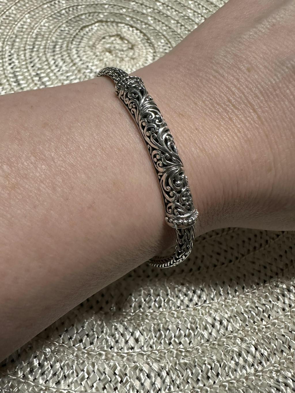 A really pretty bracelet, perhaps for everyday wear, combining the delicate and impressive 'Tree of Life' filigree-work with the traditional and substantial tulang naga chain. A fine example of extraordinary Balinese artistry and craftsmanship.
