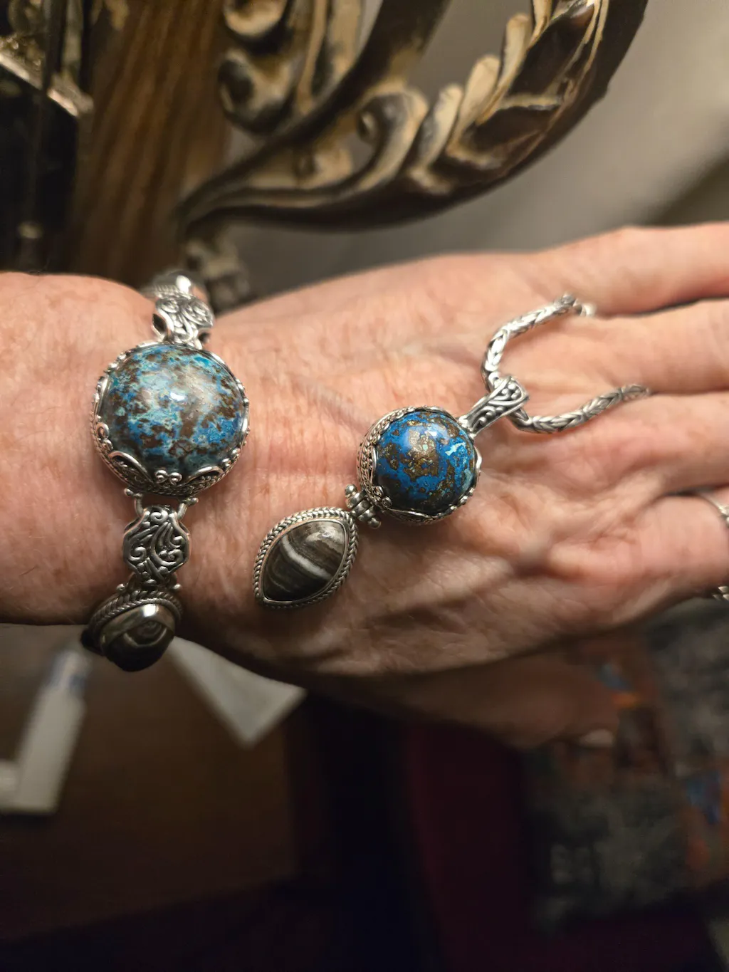 This bracelet is so gorgeous! I seen it on the live and been eyeing it for a few weeks. I'm super happy I bought it! The natural beauty of the stone is so unique and one of a kind, matched with the silver work, it's just stunning! I love Chryscolla! My set matches nicely too.