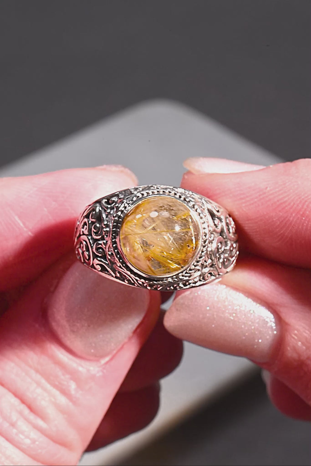The design, the swirling intricate silver filigree work, the gemstone here - mine has gorgeous thick, almost holographic, bright golden stripes of tightly woven clusters of delicate rutilated threads held within the clear quartz - are just vibrant and so full of character. The fit and comfort are perfect too. A stunning ring, magnificent artistry and a superb quality gem.