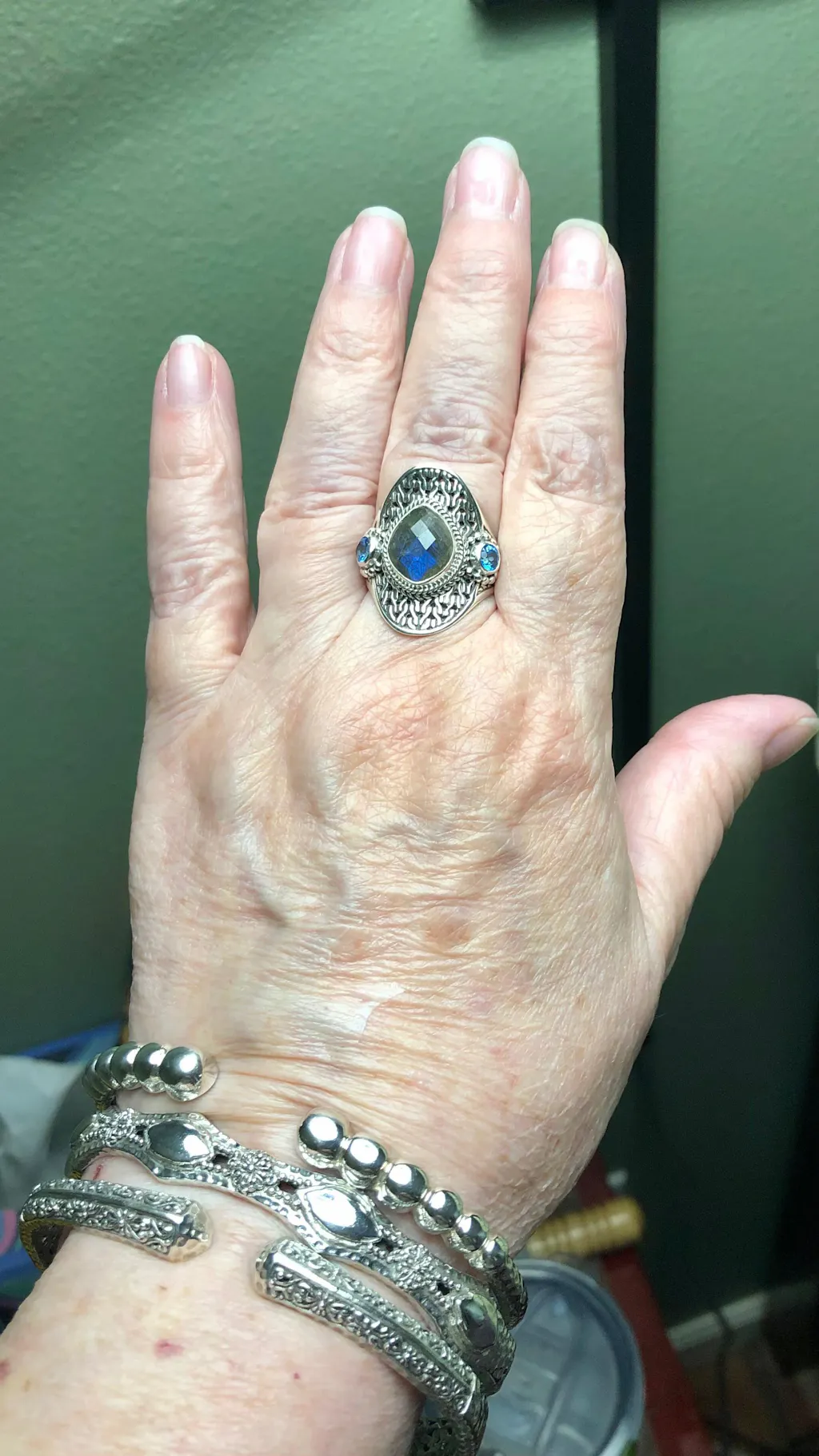 I recently purchased this lovely ring. The way it’s made, it fits like it was made for YOU. I love this style of ring and have now decided my new favorite motif is the chainlink. The labradorite glows with its many colors and the royal Bali blue accent stones are luscious. 🩵