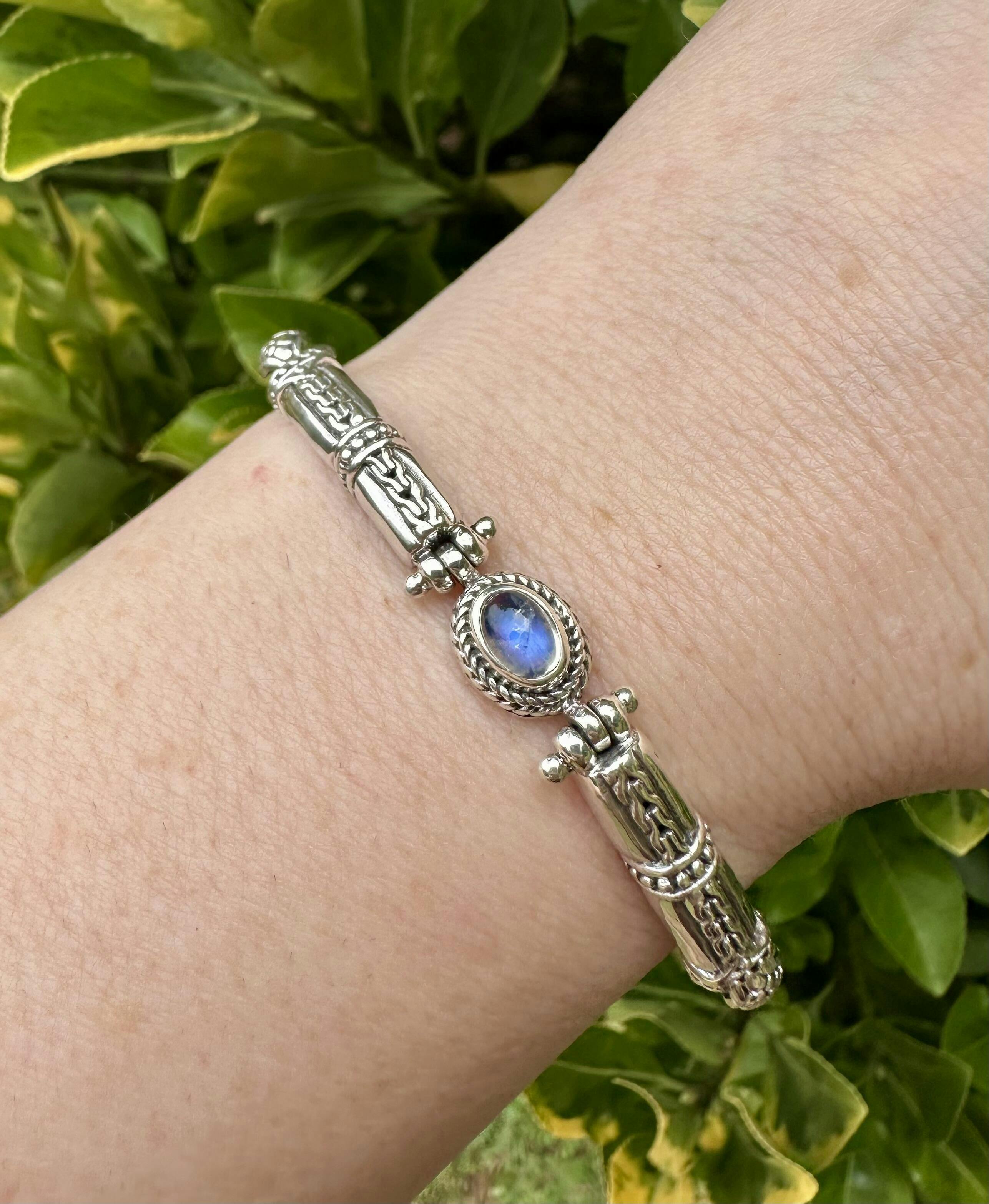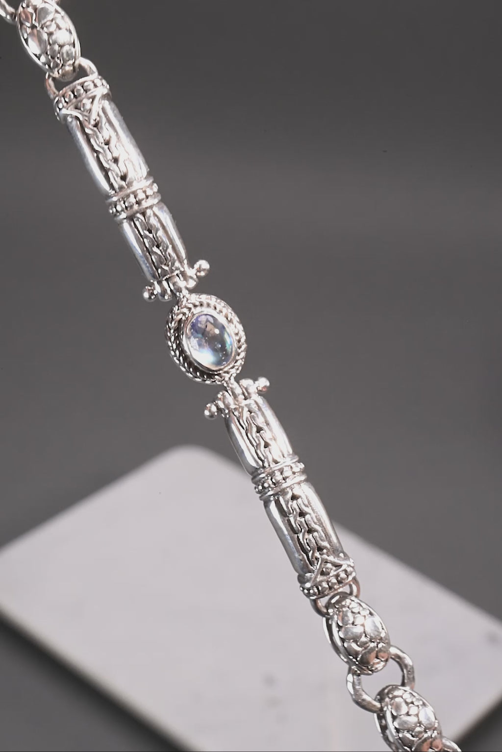 Sterling Silver Chainlink & Watermark Rainbow Moonstone Adjustable Single Stone Multi Link Lobster Claw Bracelet™