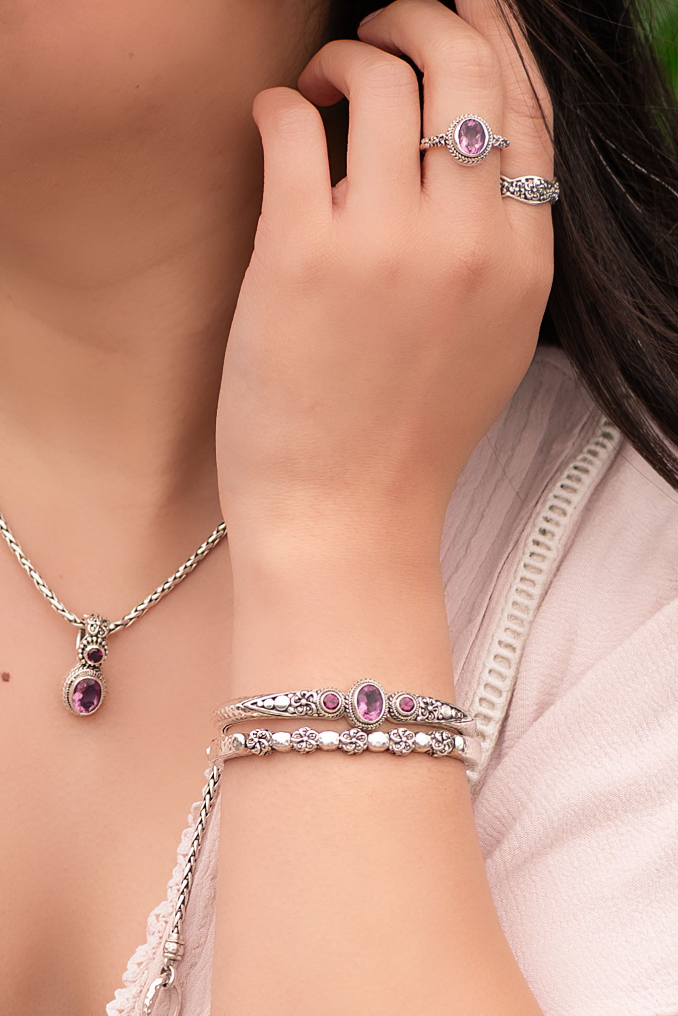 Sterling Silver Frangipani & Hammered Pink/Purple Fluorite & Rhodolite Garnet Oval Cuff Bracelet With Single Retention Kickback™