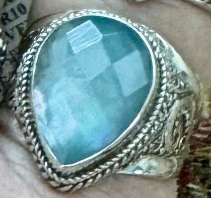 I own other light blue quartz and had bought a pendant a while back, thinking it would go with others I had. It wasn’t quite right, but I was tickled to see this one as it is a perfect match. Its large teardrop faceted stone has a lovely glimmer to it. The ring is very comfortable, true to size and will play well with other Sarda pieces. Makes a nice statement without being too big for small hands. Very pleased with purchase.
