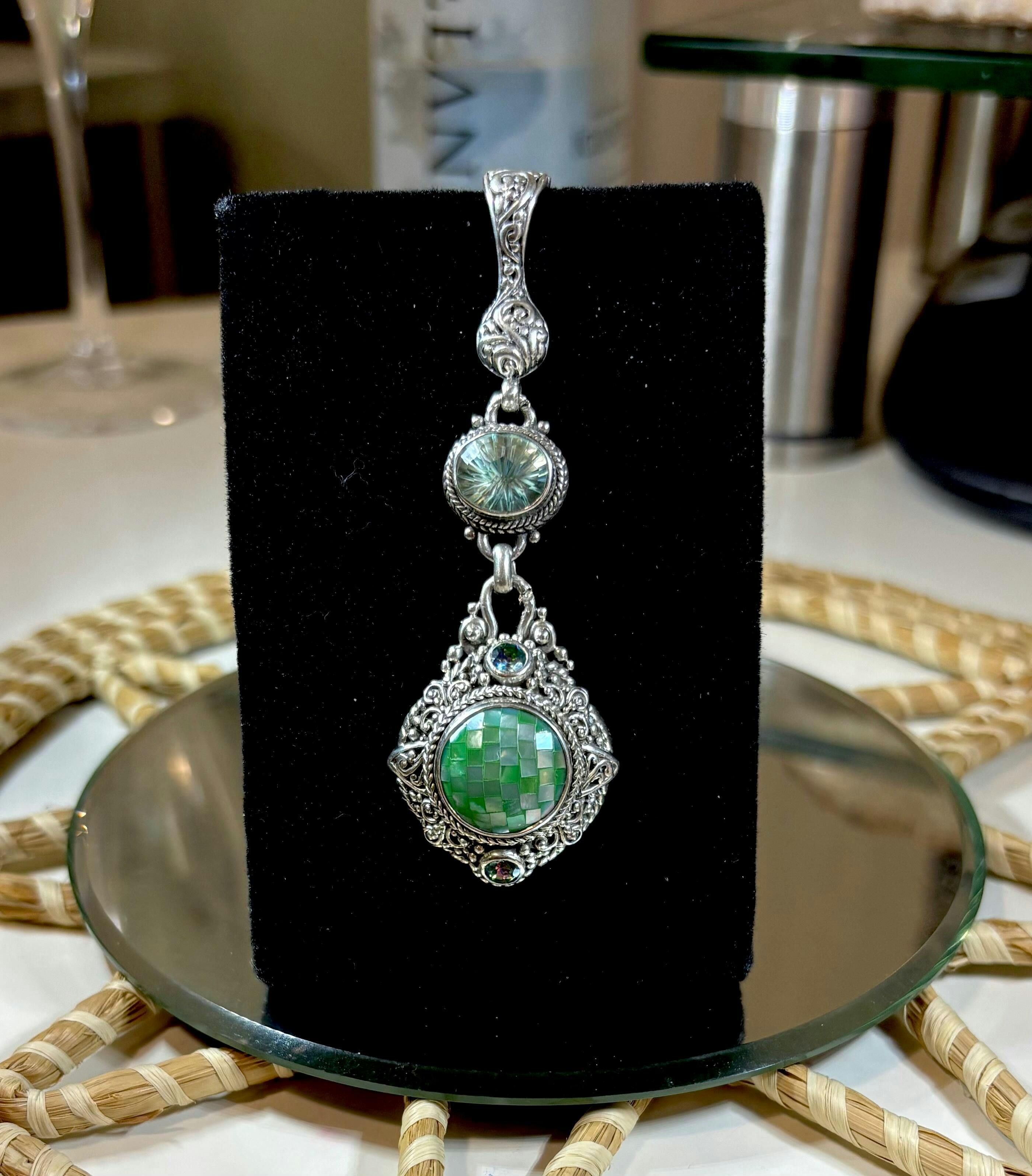 Sterling Silver Tree Of Life Green Mother Of Pearl Mosaic & Bali Crush™ Mystic Topaz Multi Stone Pendant With Magnetic Enhancer Bail™