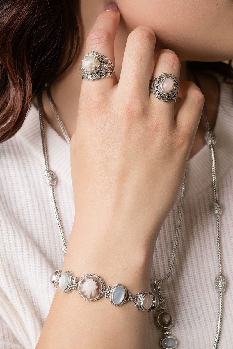 I now have way too many of Janyl’s magnificent pieces to count. It’s so embarrassing. Because I clearly have a problem. But, as I tell my husband “ It could be worse. It could be drugs, drink, or men!” My newest pair of bracelets are 2 flower agate, white moonstone, and peach moonstone beauties. I can’t begin to describe the magical combination of stones, and as always the impeccable silver work from Bali, that completely propels Janyl’s jewelry into a class of its own. Each piece of silver is hand applied…and Janyl’s one of a kind designs are beyond words. Keep making these fabulous beauties, and I’ll keep feeding my habit, my friend!