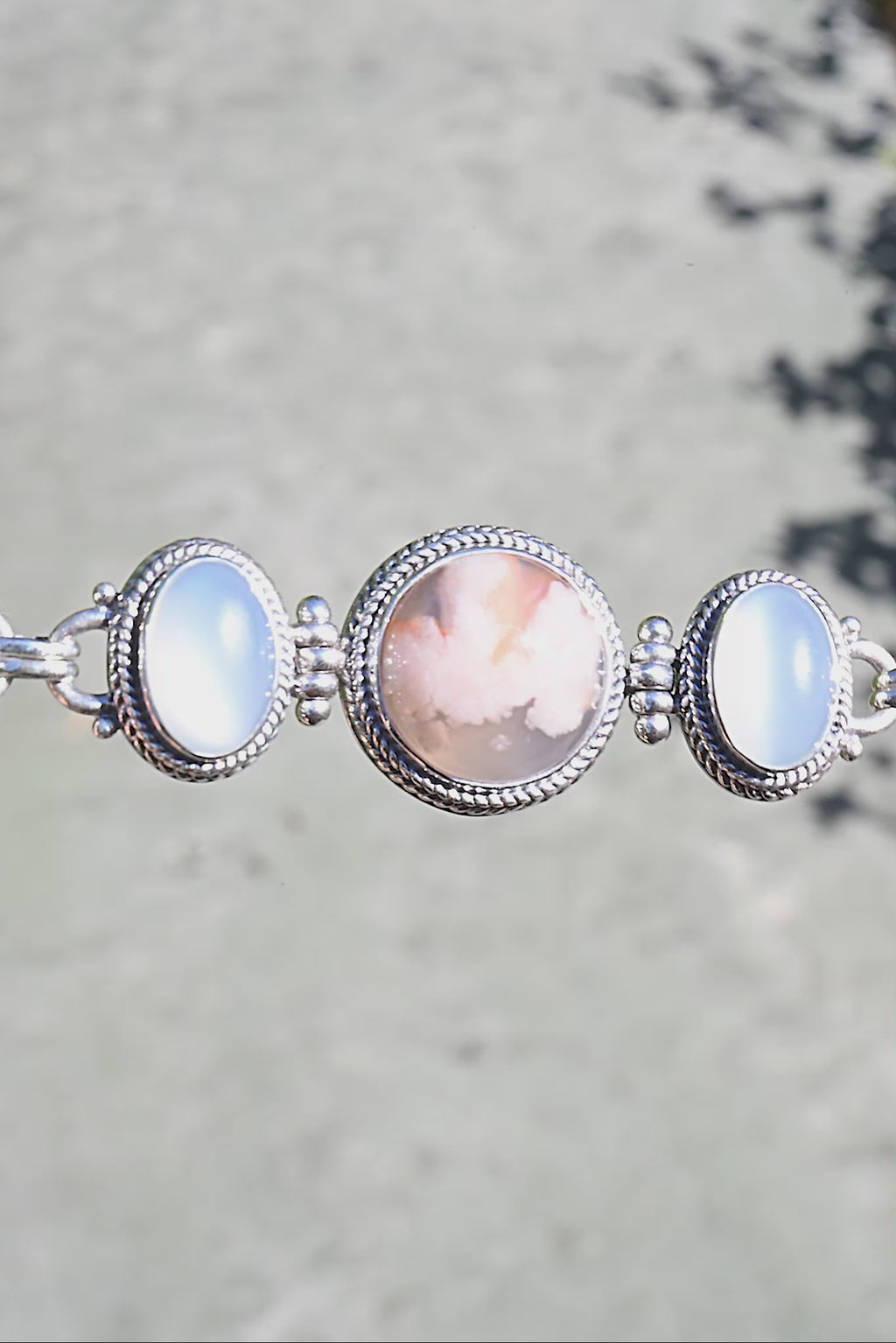 Sterling Silver Flower Agate, White Moonstone & Peach Moonstone Adjustable Multi Stone Toggle Bracelet™