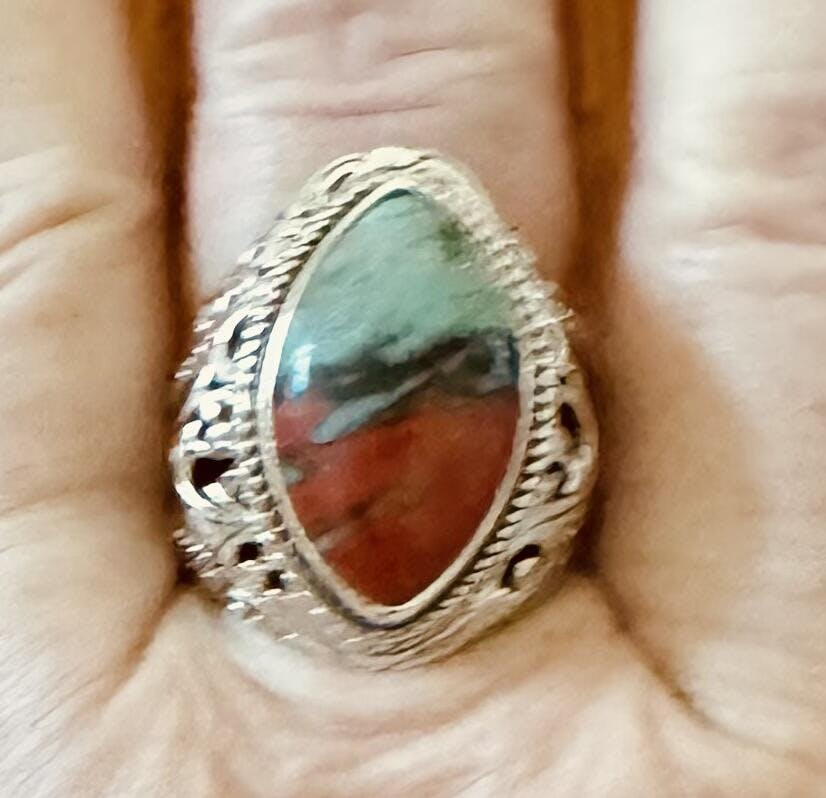 I am very pleased that this ring has vivid red and green and an equal amount of each. It is true to size and very comfortable. The chain link and tree of life silver work is very nice as well.