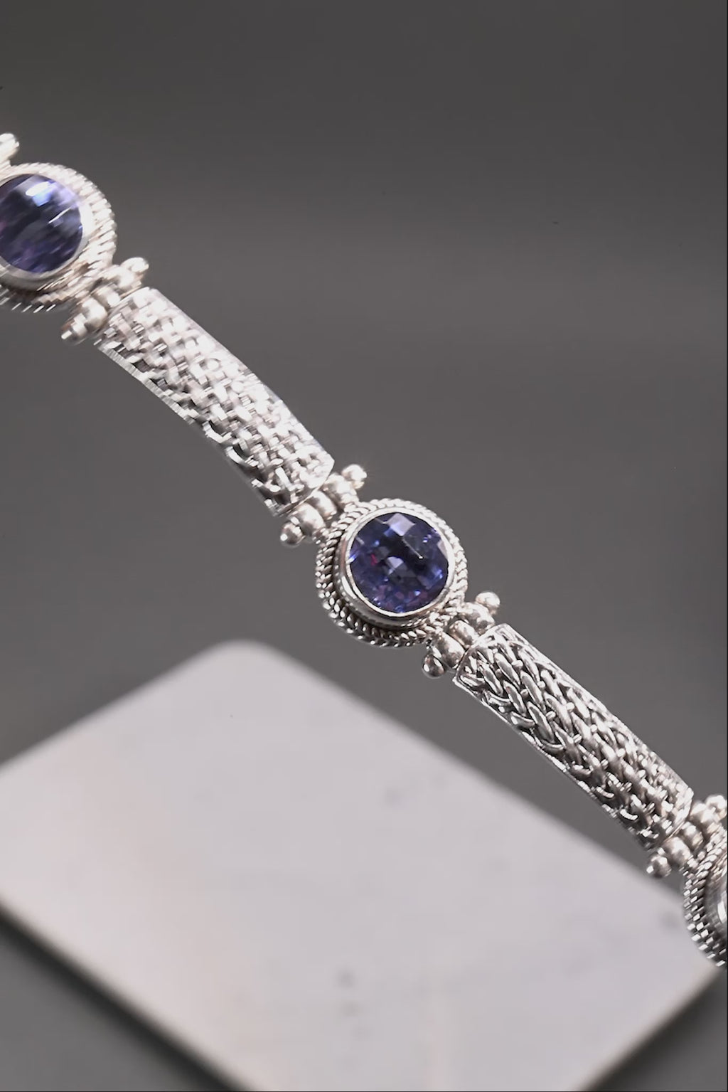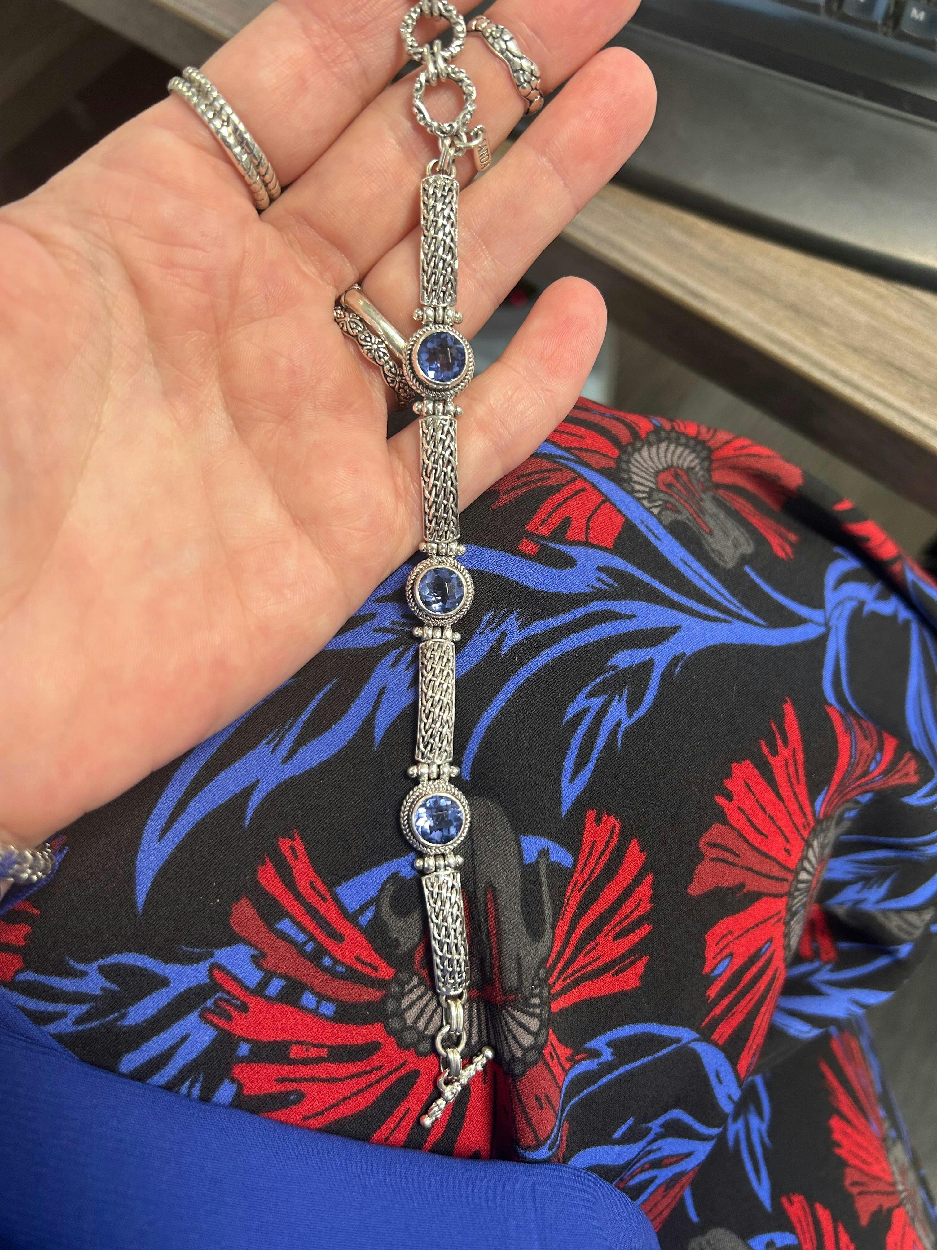 I absolutely love the design of this 3 stone bracelet. The blue violet fluorites are a rich royal blue with purple flashes. Once in the sunlight it appears teal, similar to a London blue color. Such a fun stone, but I adore the fit and comfort of this design. Need this bracelet in all the colors of the rainbow.
