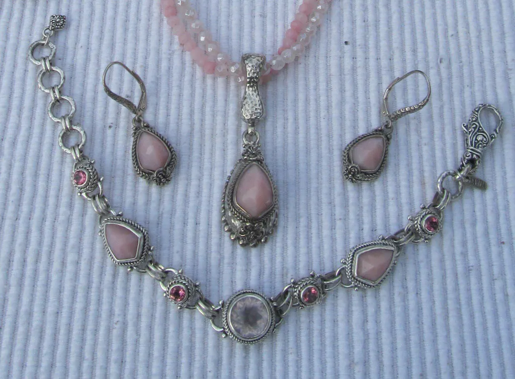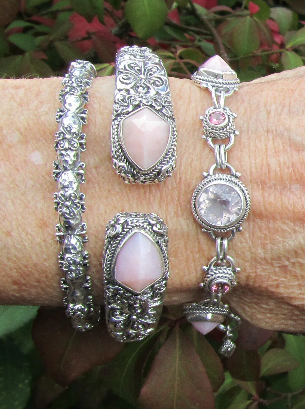 Love Janyl’s Cloud Pink Rose Quartz, especially in a lotus cut. When I saw the Pink Opal shield fancy cabochon cut, my heart skipped a beat. I have another Pink Opal Frangipani and hammered set with the same shield cabochon cut and needed this new multi stone bracelet to mix in with that collection. Gorgeous mixture of gemstones and colors contribute to this 5 star rating.