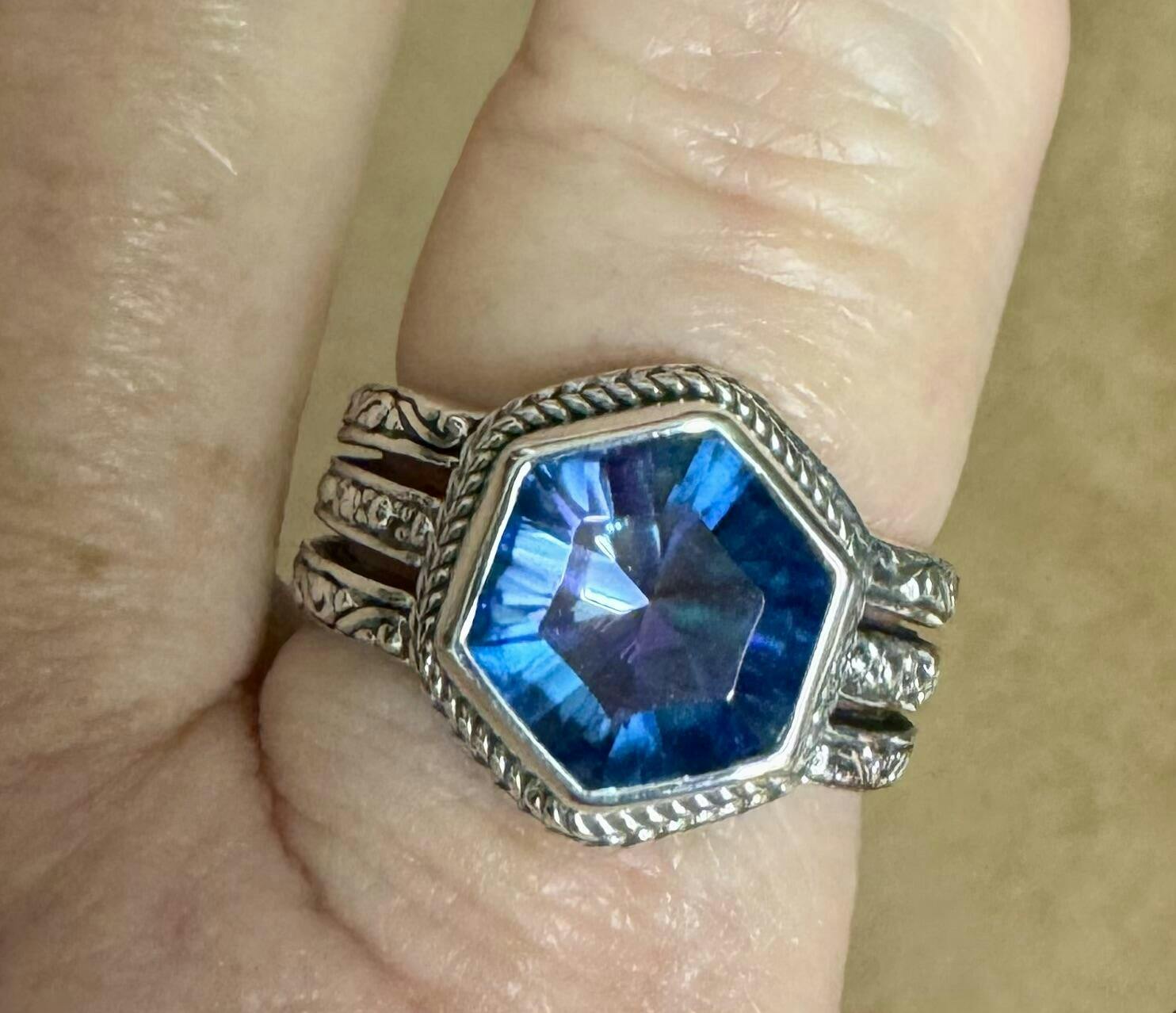 This ring has a unique hexagonal 10mm stone with a concave cut to radiate very vivid blue and violet shades of sparkle! The shank has beautiful silver work and negative space to give the illusion of 3 bands. Fit is true to size and very comfortable. Very pleased with purchase.